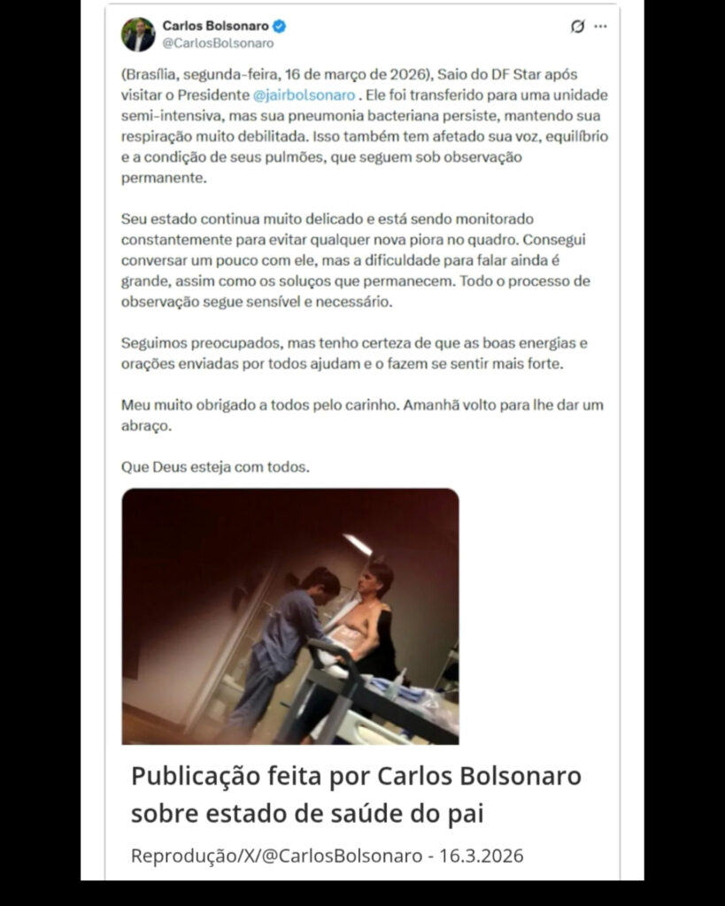 O vereador Carlos Bolsonaro publicou nesta segunda-feira (16) uma foto do ex-presidente Jair Bolsonaro durante o período de internação em um hospital de Brasília e trouxe novas informações sobre o estado de saúde do pai.