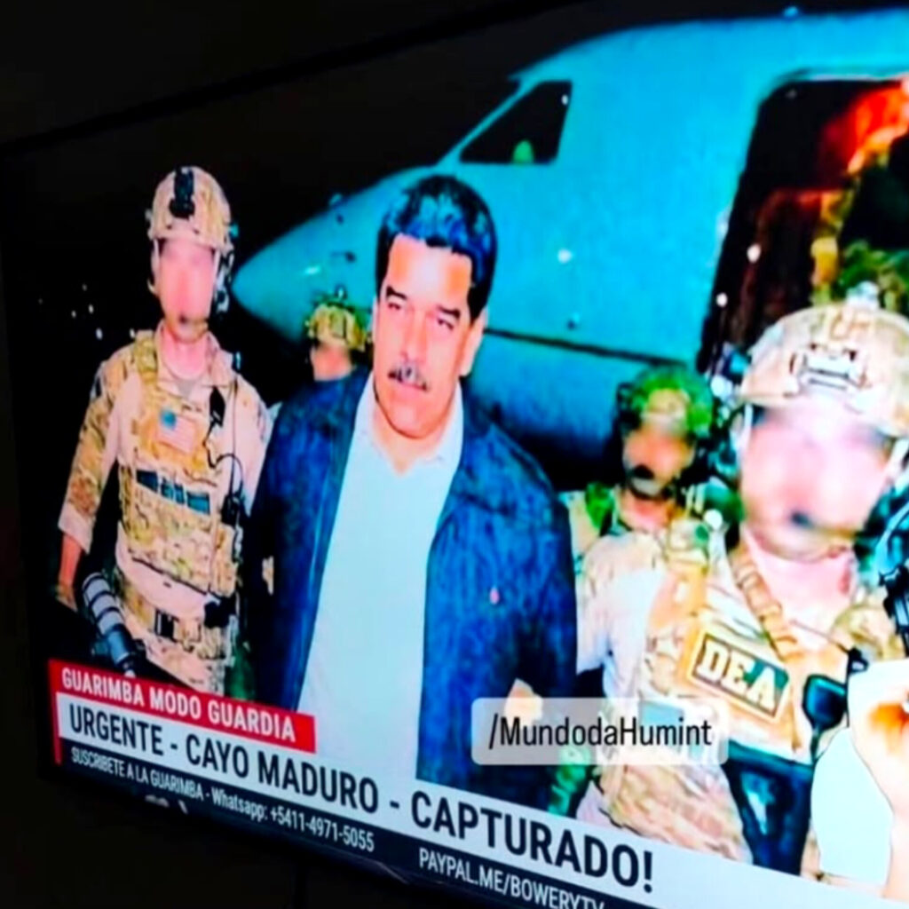 Uma imagem que começou a circular nas redes sociais na manhã deste sábado (3) estaria mostrando o momento em que o presidente da Venezuela, Nicolás Maduro, teria sido capturado durante uma operação militar atribuída às Forças Arm∆das dos Estados Unidos.